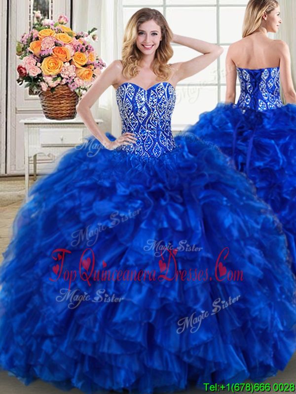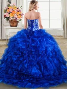 With Train Lace Up Ball Gown Prom Dress Royal Blue and In for Military Ball and Sweet 16 and Quinceanera with Beading and Ruffles Brush Train
