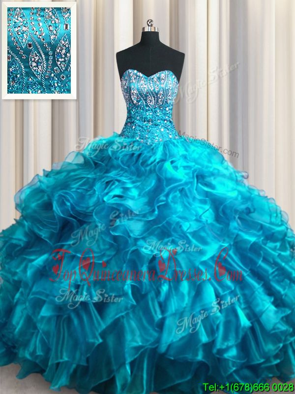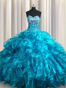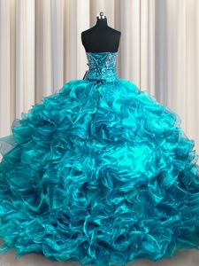 With Train Lace Up Quince Ball Gowns Teal and In for Military Ball and Sweet 16 and Quinceanera with Beading and Ruffles Brush Train