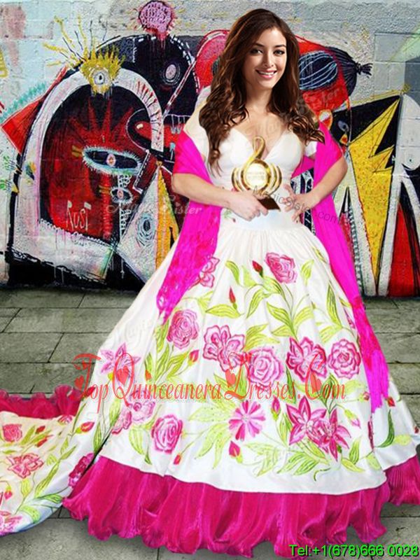 With Train Lace Up Sweet 16 Quinceanera Dress White and In for Military Ball and Sweet 16 and Quinceanera with Embroidery Brush Train