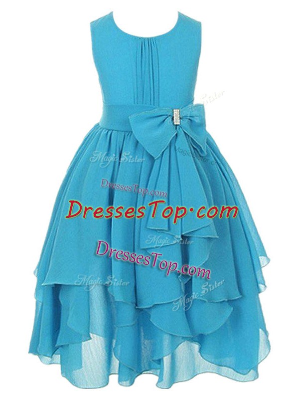 Wonderful Aqua Blue Sleeveless Asymmetrical Ruffles and Bowknot Zipper Child Pageant Dress
