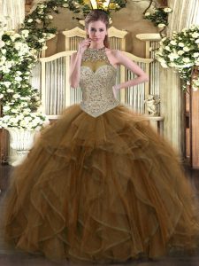 Wonderful Brown Halter Top Neckline Beading and Ruffles Quinceanera Gown Sleeveless Lace Up