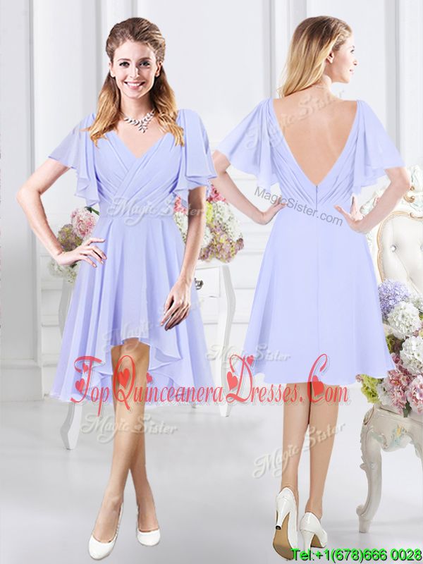 Wonderful Chiffon V-neck Short Sleeves Zipper Ruching Court Dresses for Sweet 16 in Lavender