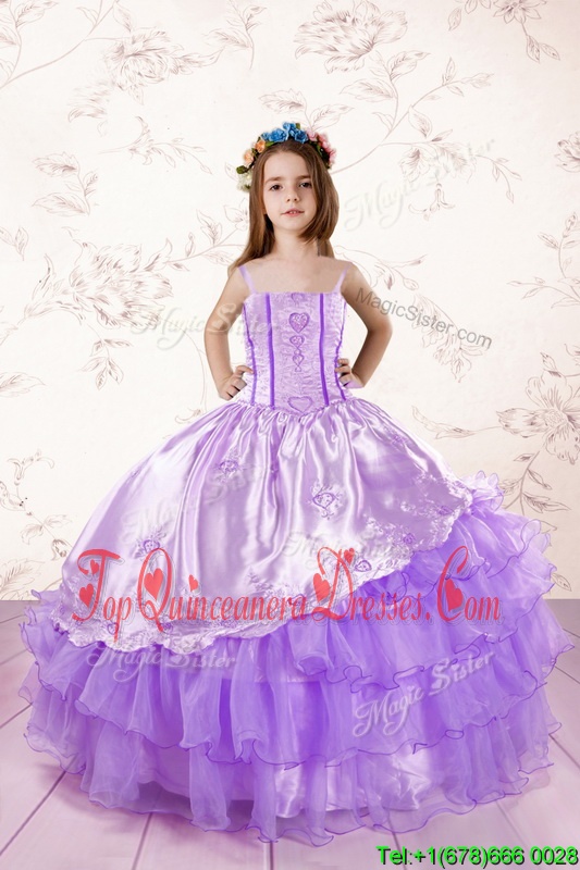 Wonderful Floor Length Lavender Custom Made Pageant Dress Organza Sleeveless Embroidery and Ruffled Layers