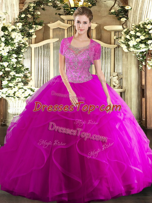 Wonderful Fuchsia Ball Gowns Tulle Scoop Sleeveless Beading and Ruffled Layers Floor Length Clasp Handle Sweet 16 Dresses