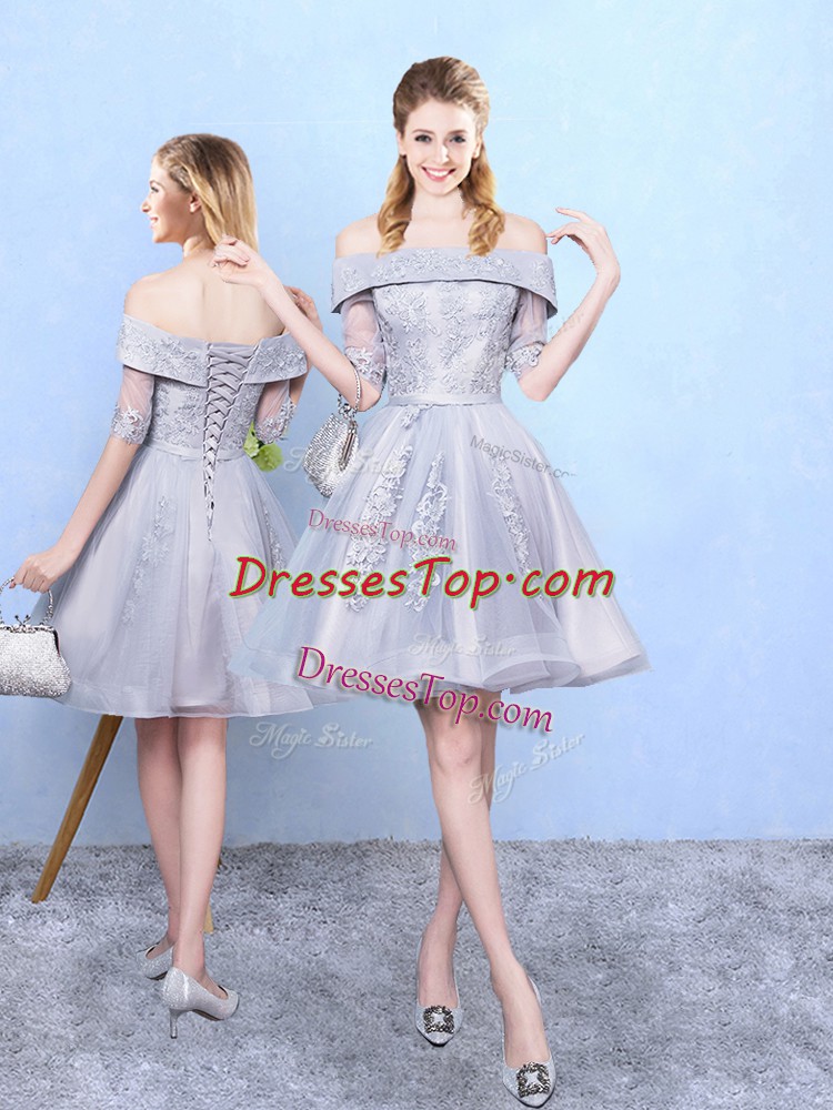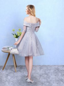 Wonderful Grey Tulle Lace Up Off The Shoulder Half Sleeves Knee Length Quinceanera Court Dresses Appliques