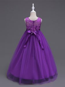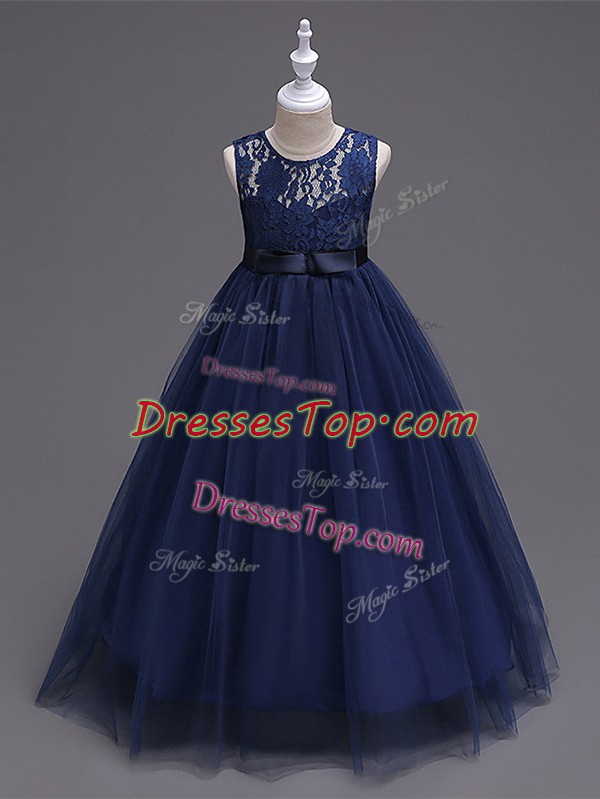 Wonderful Navy Blue A-line Tulle Scoop Sleeveless Lace Floor Length Zipper Custom Made Pageant Dress