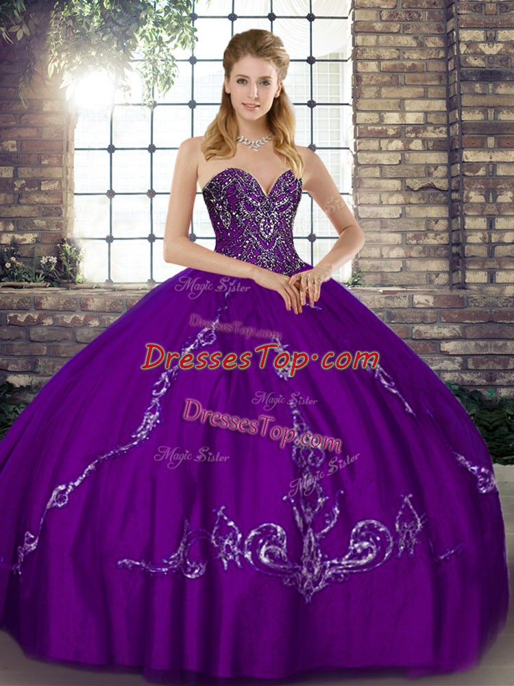 Wonderful Purple Tulle Lace Up 15 Quinceanera Dress Sleeveless Floor Length Beading and Embroidery