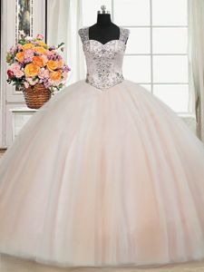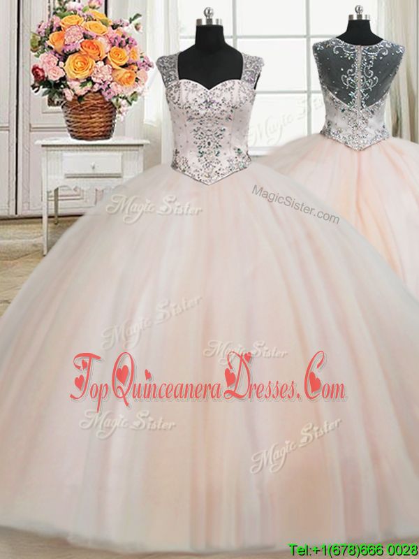 Wonderful See Through Back Zipper Up Straps Beading 15 Quinceanera Dress Peach Zipper Cap Sleeves Floor Length