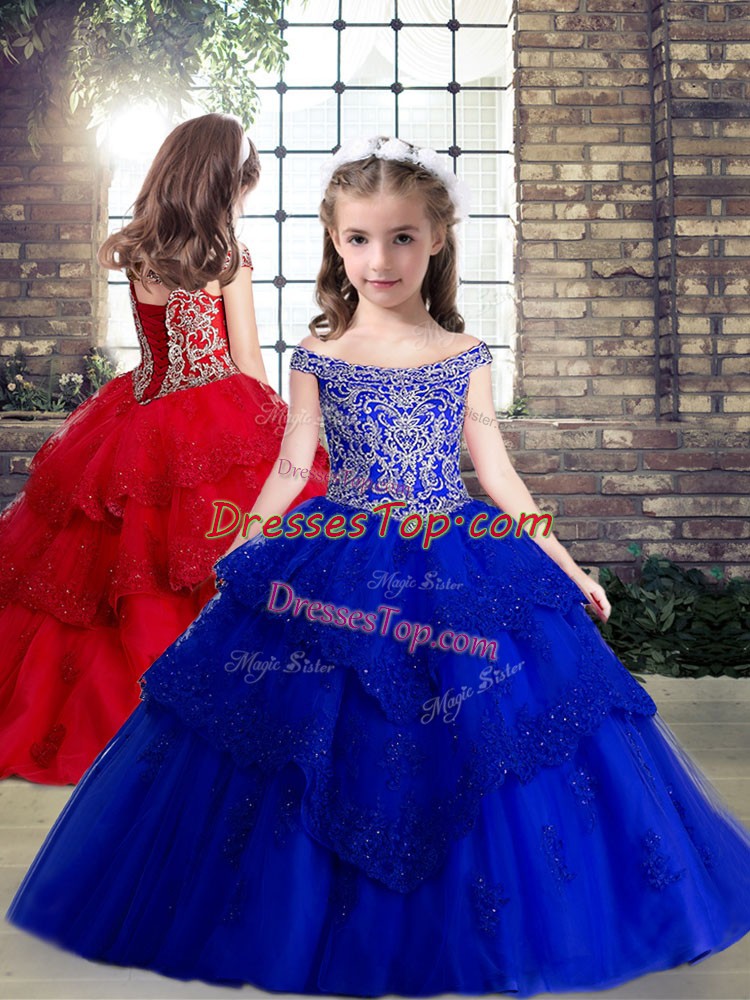 Wonderful Sleeveless Floor Length Beading and Appliques Lace Up Child Pageant Dress with Royal Blue