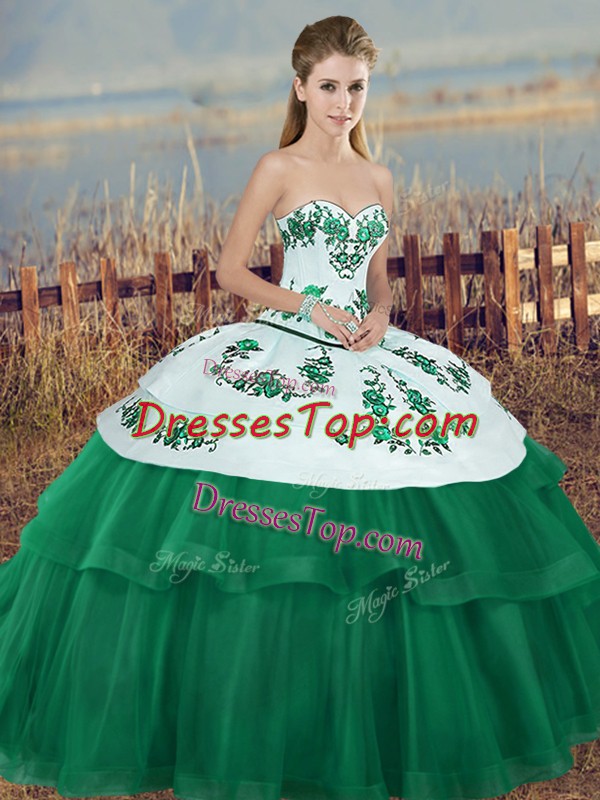 Wonderful Sleeveless Tulle Floor Length Lace Up Quince Ball Gowns in Green with Embroidery and Bowknot