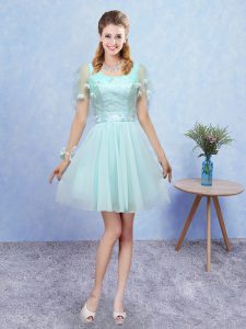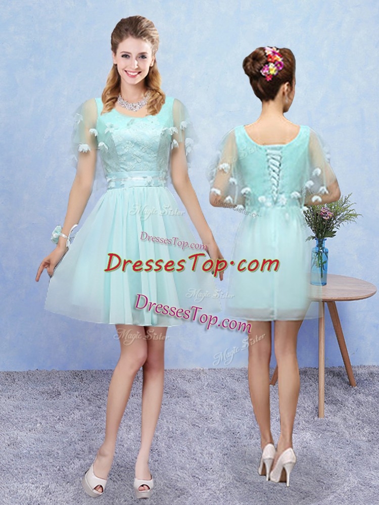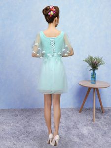 Wonderful Sleeveless Tulle Mini Length Lace Up Quinceanera Dama Dress in Aqua Blue with Appliques