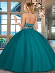 Wonderful Teal Two Pieces Tulle Halter Top Sleeveless Beading Floor Length Backless Sweet 16 Dresses