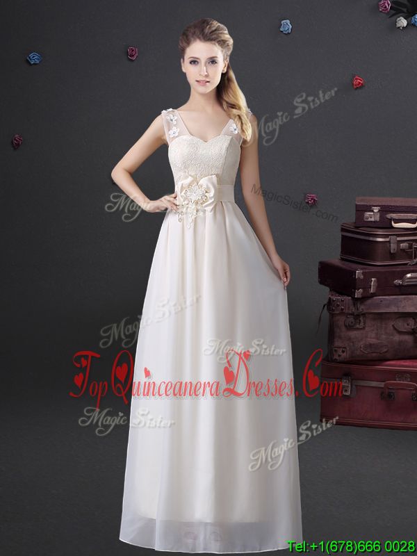 Wonderful White Quinceanera Court Dresses Prom and Party and Wedding Party and For with Lace and Appliques and Bowknot V-neck Sleeveless Zipper