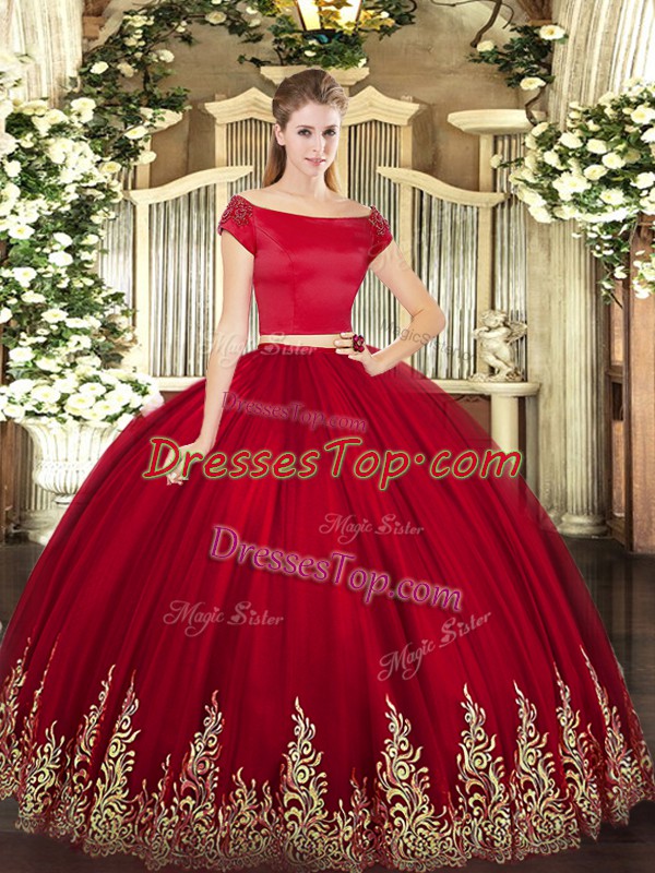 Wonderful Wine Red Tulle Zipper Off The Shoulder Short Sleeves Floor Length Quinceanera Dresses Appliques