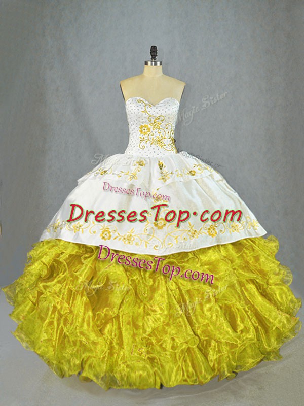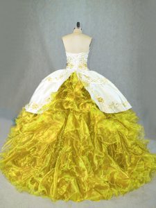 Yellow Ball Gowns Sweetheart Sleeveless Satin and Organza Brush Train Lace Up Beading and Embroidery and Ruffles Sweet 16 Dress