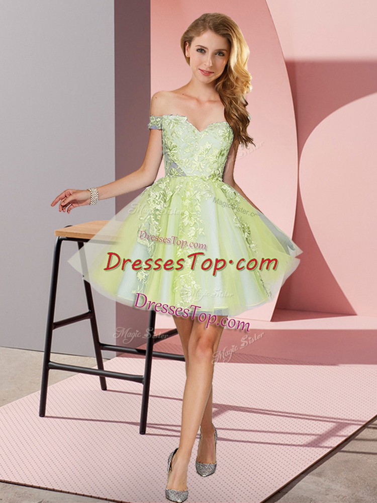 Yellow Green A-line Tulle Off The Shoulder Sleeveless Appliques Mini Length Zipper Quinceanera Dama Dress