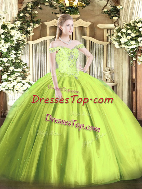 Yellow Green Ball Gowns Off The Shoulder Sleeveless Tulle Floor Length Lace Up Beading Sweet 16 Dress