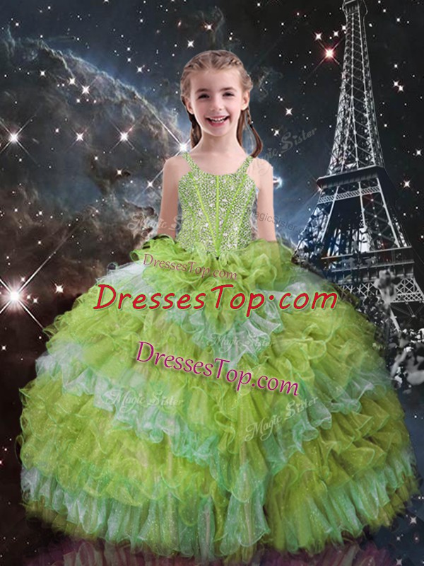 Yellow Green Ball Gowns Organza Straps Sleeveless Beading and Ruffled Layers Floor Length Lace Up Little Girl Pageant Dress