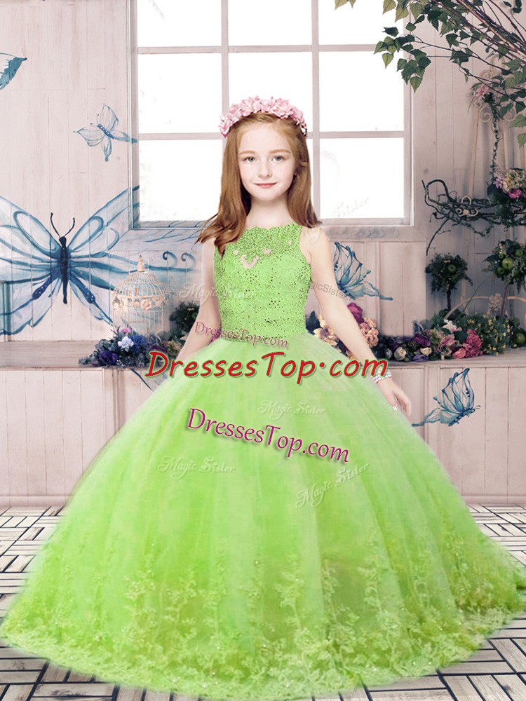 Yellow Green Ball Gowns Scoop Sleeveless Tulle Floor Length Backless Lace and Appliques Kids Pageant Dress