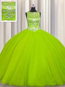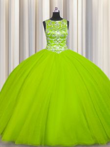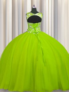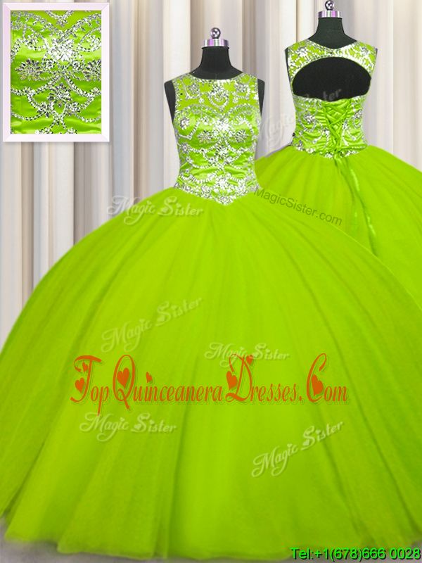 Yellow Green Ball Gowns Scoop Sleeveless Tulle Floor Length Lace Up Beading Quinceanera Dress