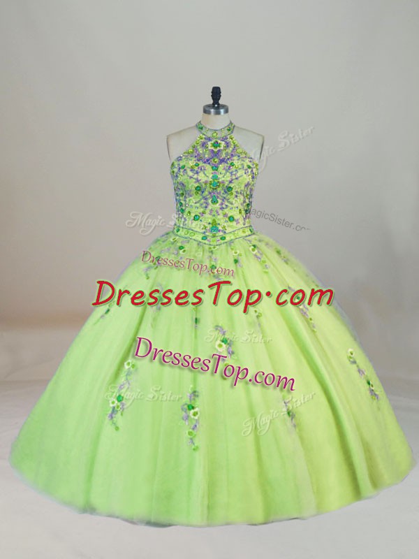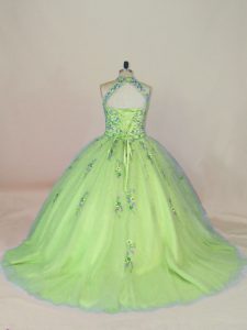 Yellow Green Halter Top Lace Up Embroidery Sweet 16 Dresses Brush Train Sleeveless