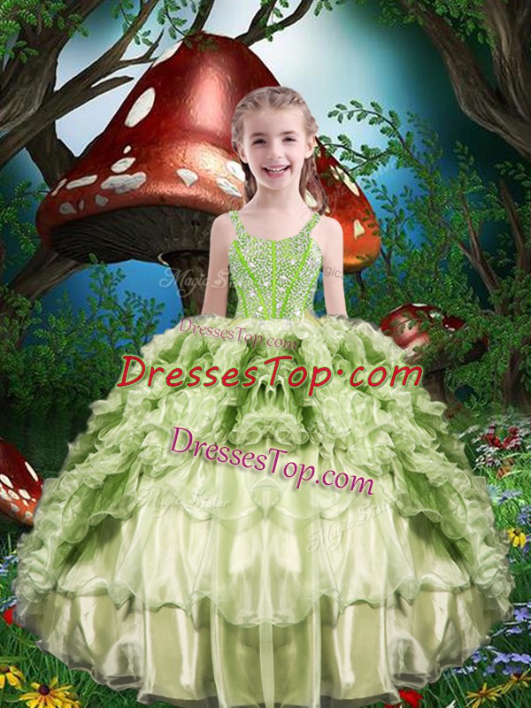Yellow Green Lace Up Straps Beading and Ruffles and Ruffled Layers Girls Pageant Dresses Organza Short Sleeves