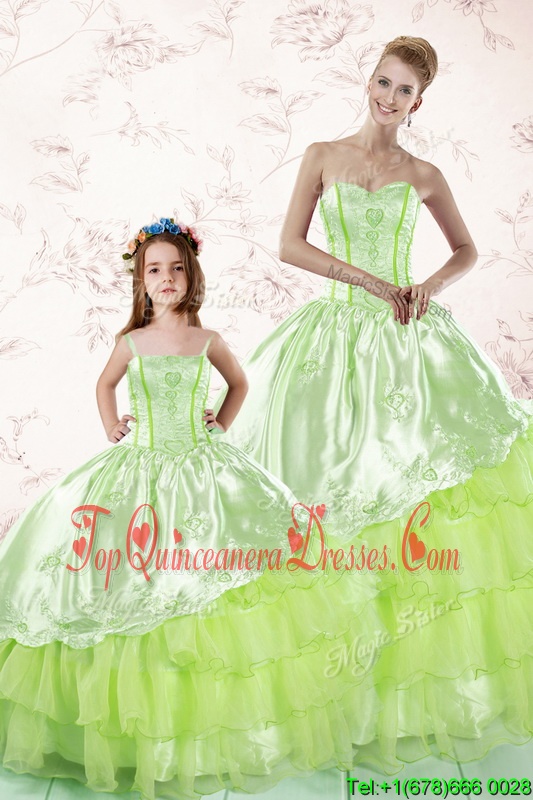 Yellow Green Organza Lace Up 15 Quinceanera Dress Sleeveless Floor Length Embroidery and Ruffled Layers