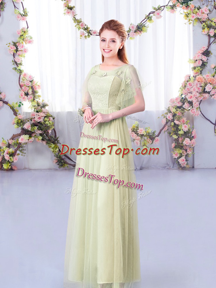 Yellow Green Side Zipper Scoop Lace and Belt Quinceanera Court of Honor Dress Tulle Short Sleeves