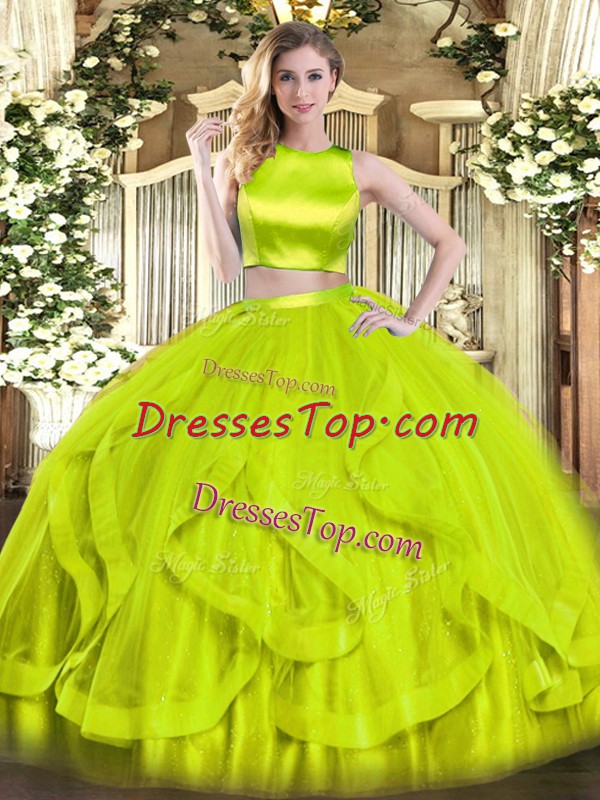 Yellow Green Sleeveless Tulle Criss Cross Sweet 16 Dresses for Military Ball and Sweet 16 and Quinceanera
