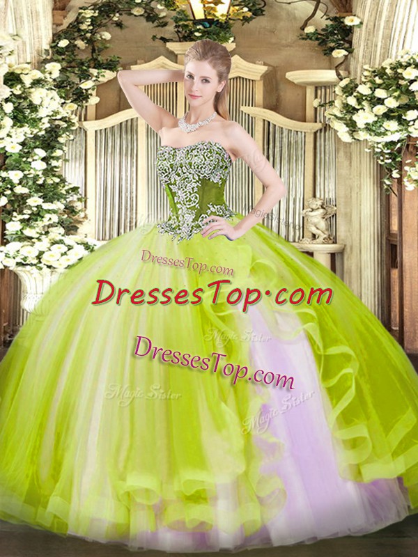 Yellow Green Sweet 16 Dresses Military Ball and Sweet 16 and Quinceanera with Beading and Ruffles Strapless Sleeveless Lace Up
