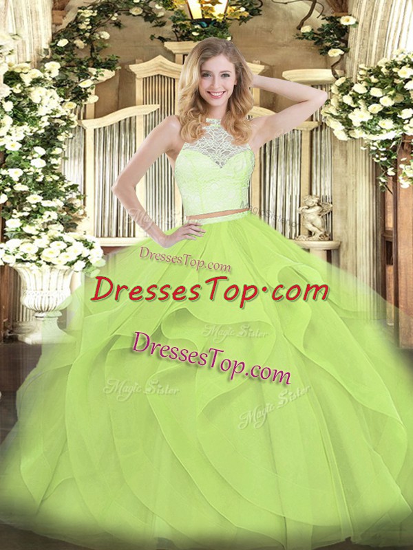 Yellow Green Tulle Zipper Sweet 16 Dresses Sleeveless Floor Length Lace and Ruffles