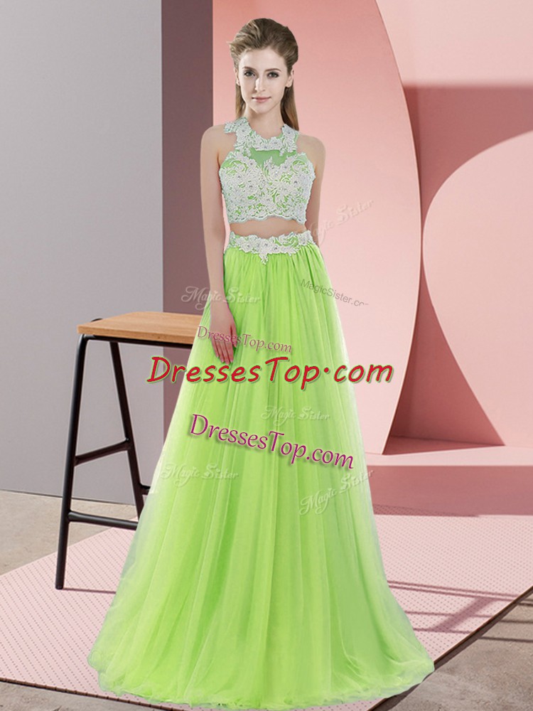 Yellow Green Two Pieces Halter Top Sleeveless Tulle Floor Length Zipper Lace Court Dresses for Sweet 16