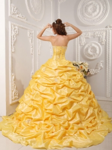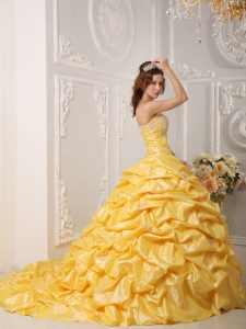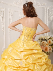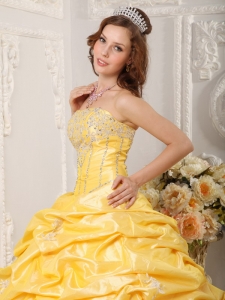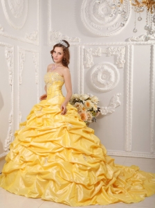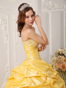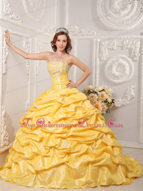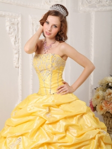 ruched yellow sweet sixteen quinceanera dresses, Yellow Quinceanera Dress Strapless Taffeta Appliques Beading