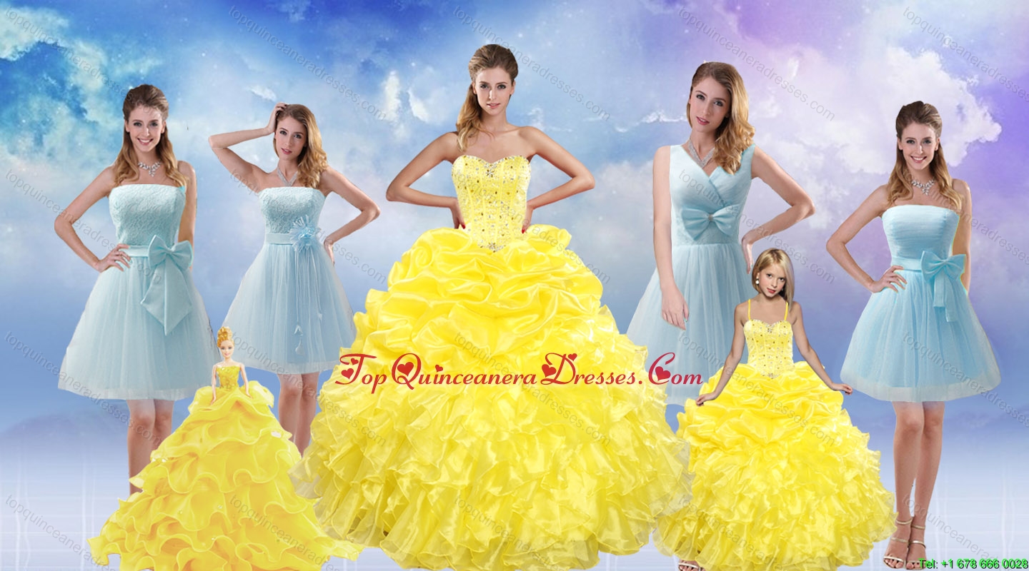 Yellow Sweetheart Rufflers Beading Quinceanera Dress and Bownot Short Prom Dresses and Yellow Spaghetti Straps Beading Pageant Dresses for Little Girl
