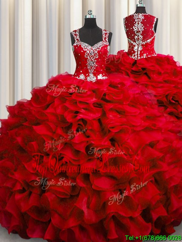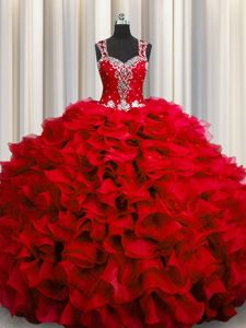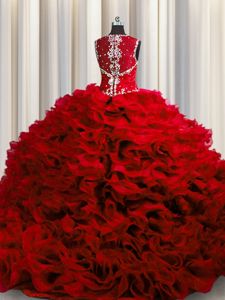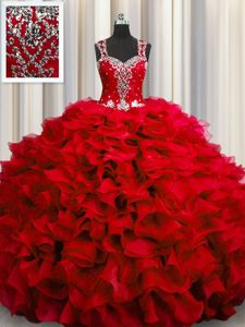 Zipple Up See Through Back Sleeveless Organza Floor Length Zipper Quinceanera Court of Honor Dress in Wine Red for with Beading and Ruffles
